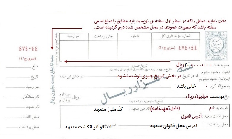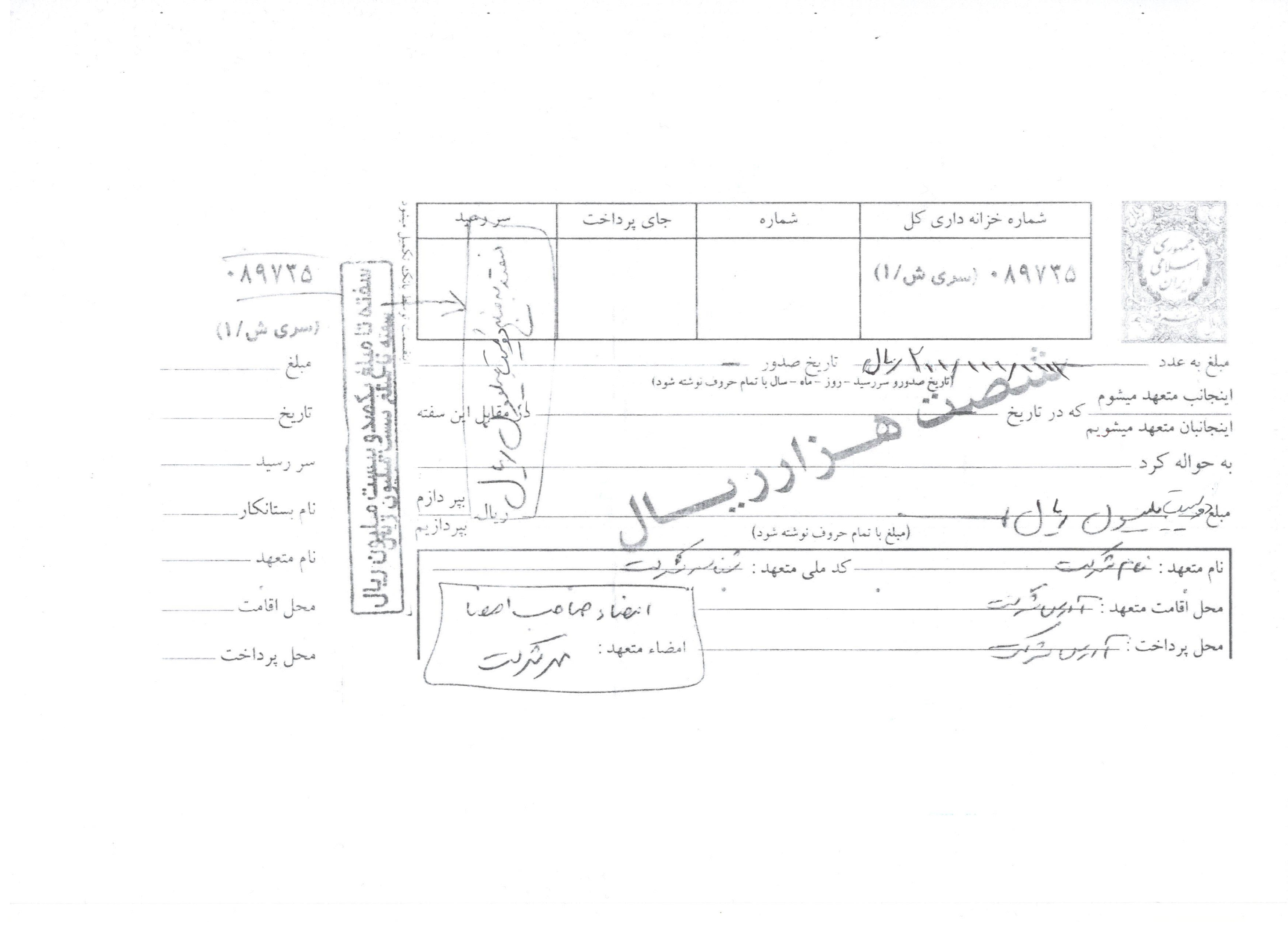 ارائه سفته به مبلغ 20 میلیون تومانی با امضا و اثر انگشت متقاضی (نمونه سفته حقیقی)